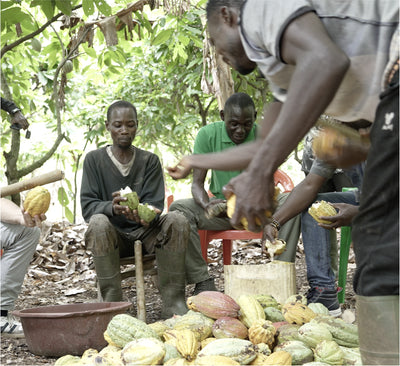 - Harvesting and splitting cocoa pods with dangerous tools.